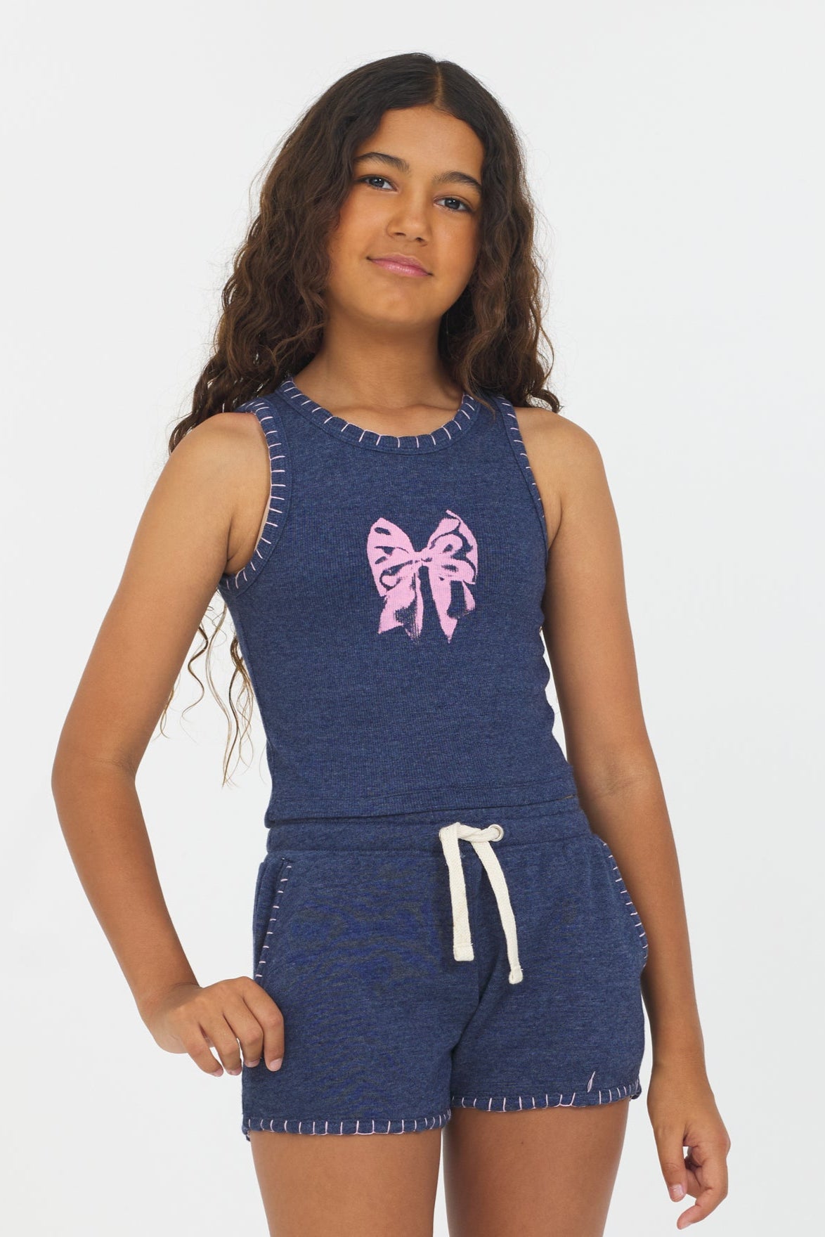 This Navy Bow Stitch Tank combines elegant stitch detailing with a playful bow print pattern. The versatile tank silhouette makes it perfect for layering or wearing solo during warmer months.