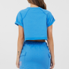 The Azure Blue Fleece Tee w/ Print offers a comfortable, casual look with its soft fleece fabric. Designed with short sleeves and a cropped fit, it provides a modern silhouette perfect for layering or wearing on its own. This tee combines cozy warmth with stylish simplicity, making it a versatile addition to your wardrobe.