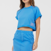 The Azure Blue Fleece Tee w/ Print offers a comfortable, casual look with its soft fleece fabric. Designed with short sleeves and a cropped fit, it provides a modern silhouette perfect for layering or wearing on its own. This tee combines cozy warmth with stylish simplicity, making it a versatile addition to your wardrobe.