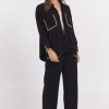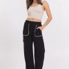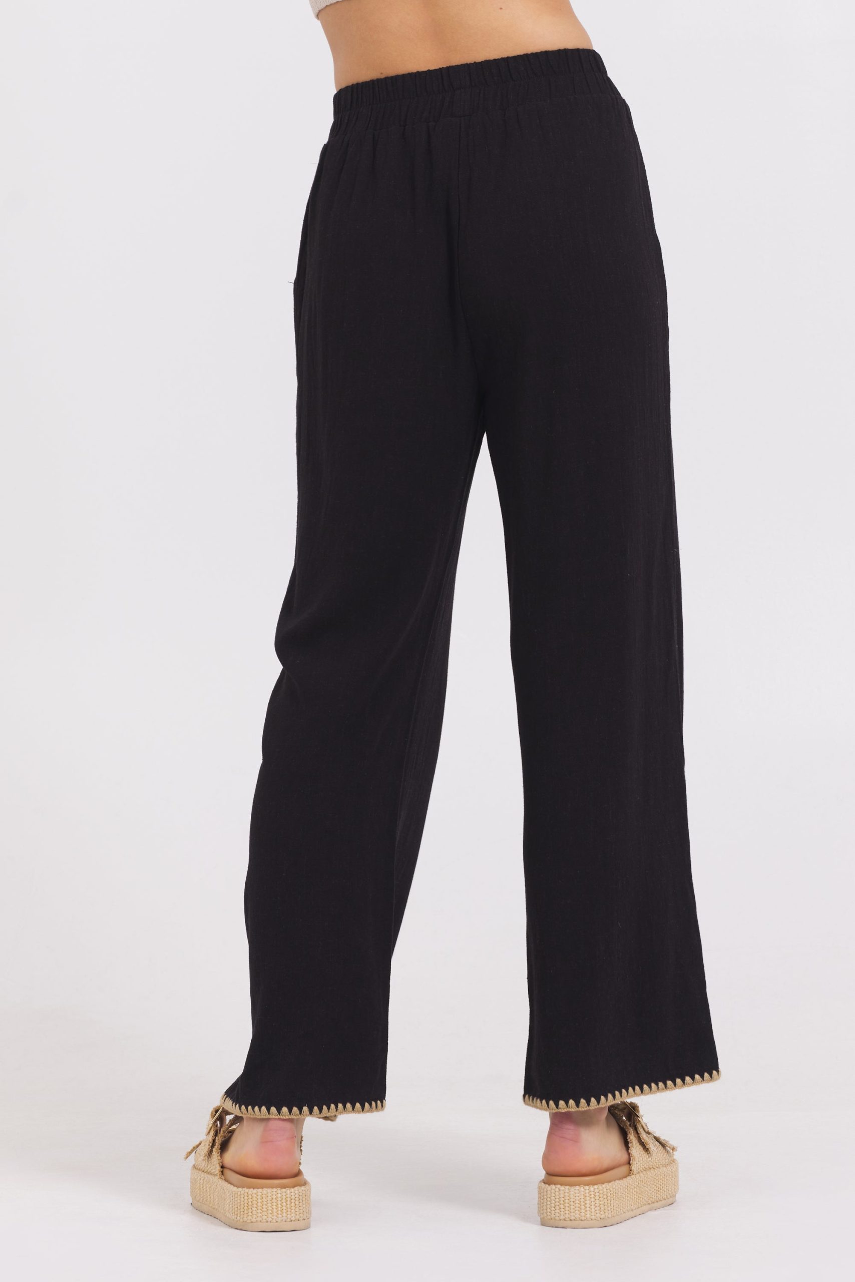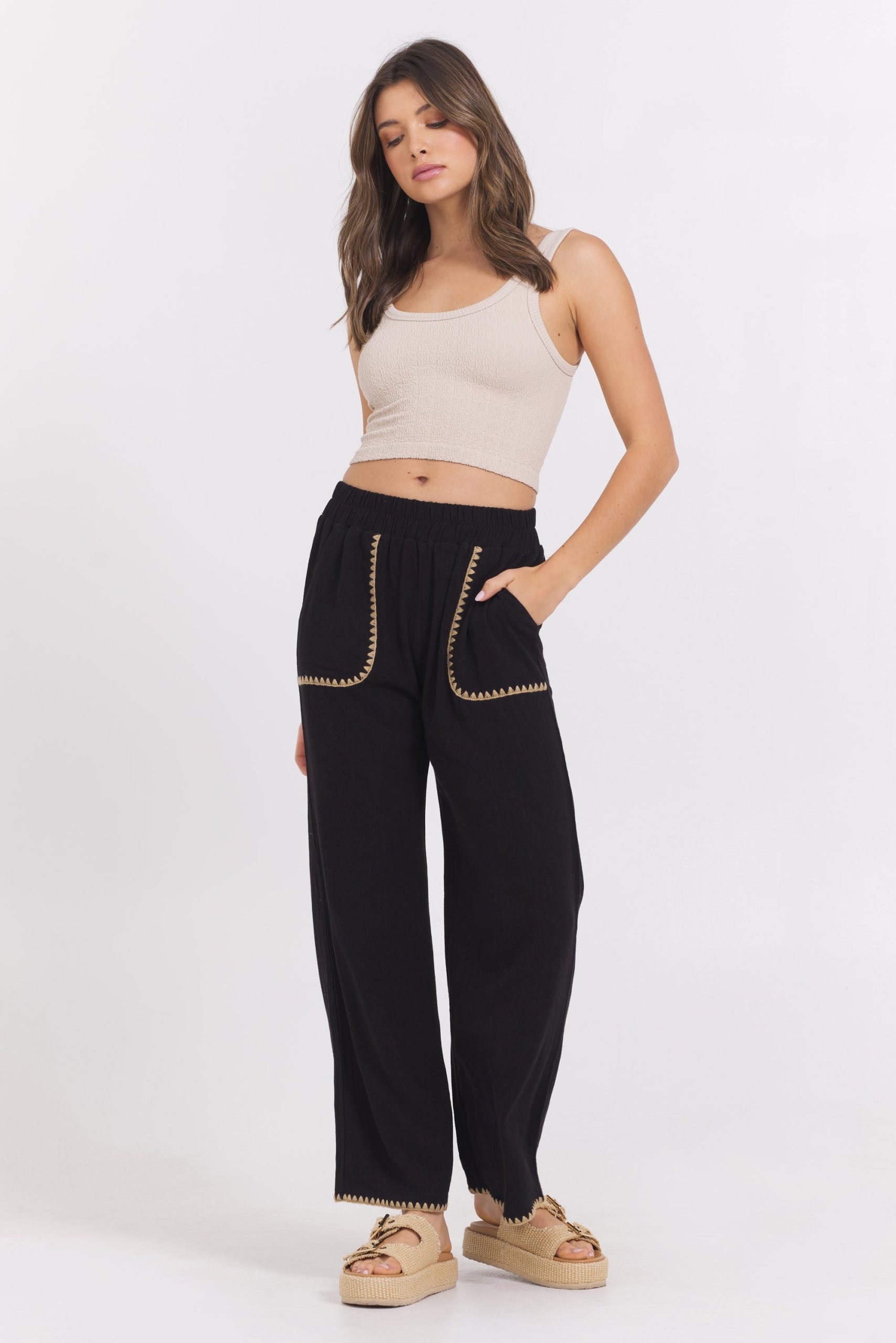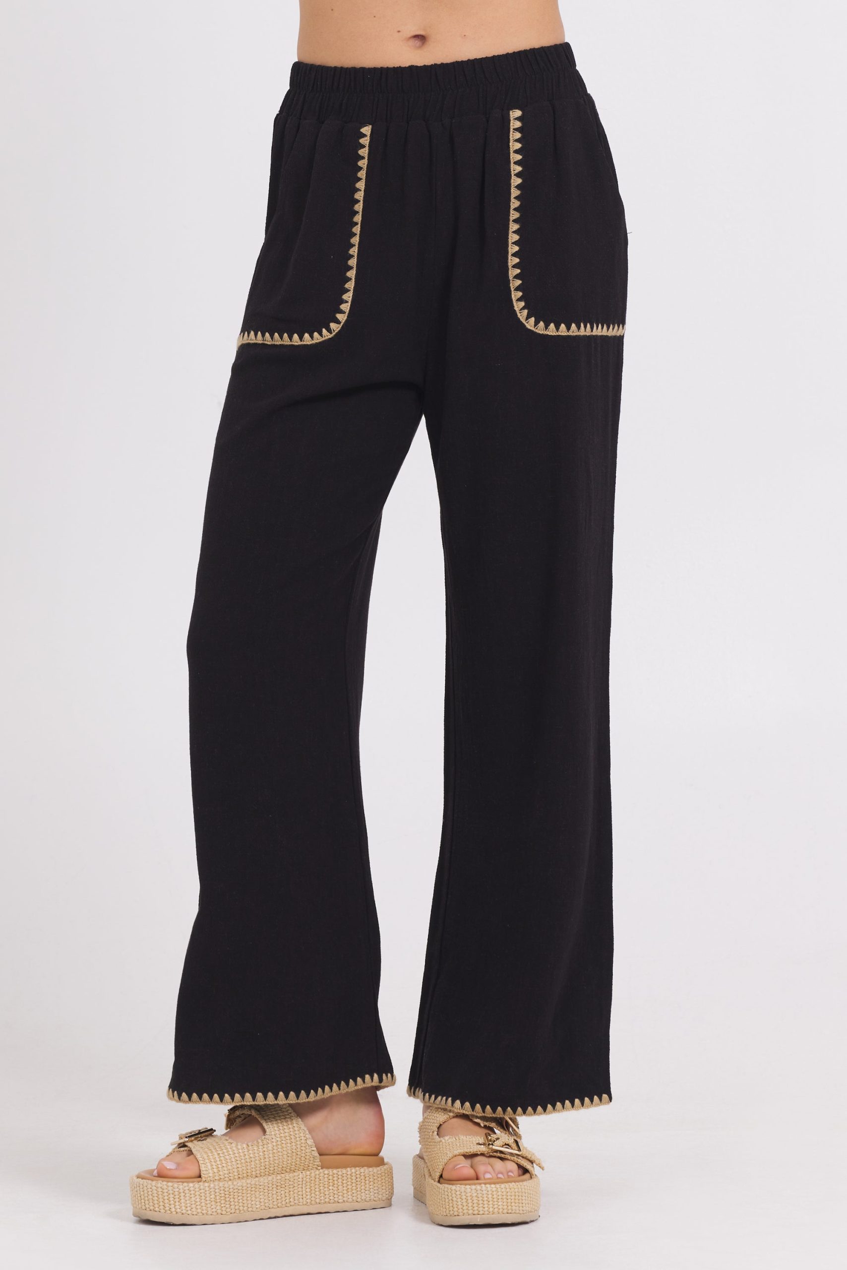 These black wide leg pants feature distinctive tan whip stitch detailing on the pockets, adding a subtle yet stylish touch. The wide leg cut offers comfort and a flattering silhouette, making them a versatile choice for both professional and casual settings. Perfect for elevating your wardrobe with understated elegance.