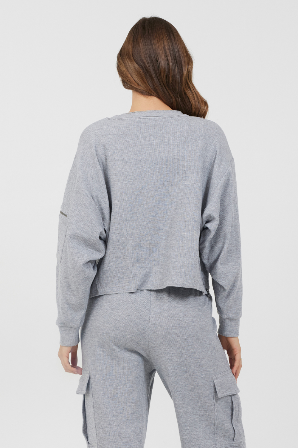 The Heather Grey Bounded Textured Jersey Utility Crewneck combines casual comfort with practical design. Its cropped crewneck silhouette offers a modern fit, while the textured jersey fabric adds subtle depth. A convenient sleeve pocket enhances functionality, making this piece both stylish and useful for everyday wear.