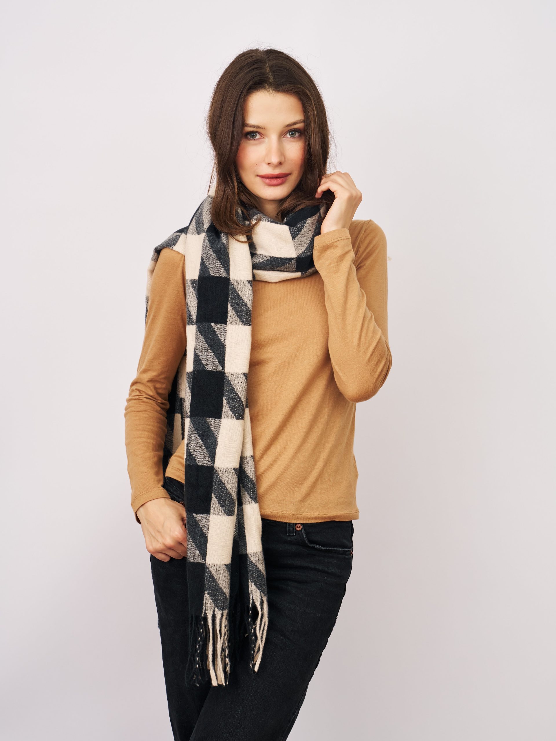 This oversized houndstooth scarf combines classic patterning with modern comfort. Made from 100% polyester, it offers a soft, lightweight feel while providing warmth. The fringe tassels add a stylish touch, making it a versatile accessory for both casual and polished looks. Perfect for layering during cooler days, it effortlessly elevates any outfit.