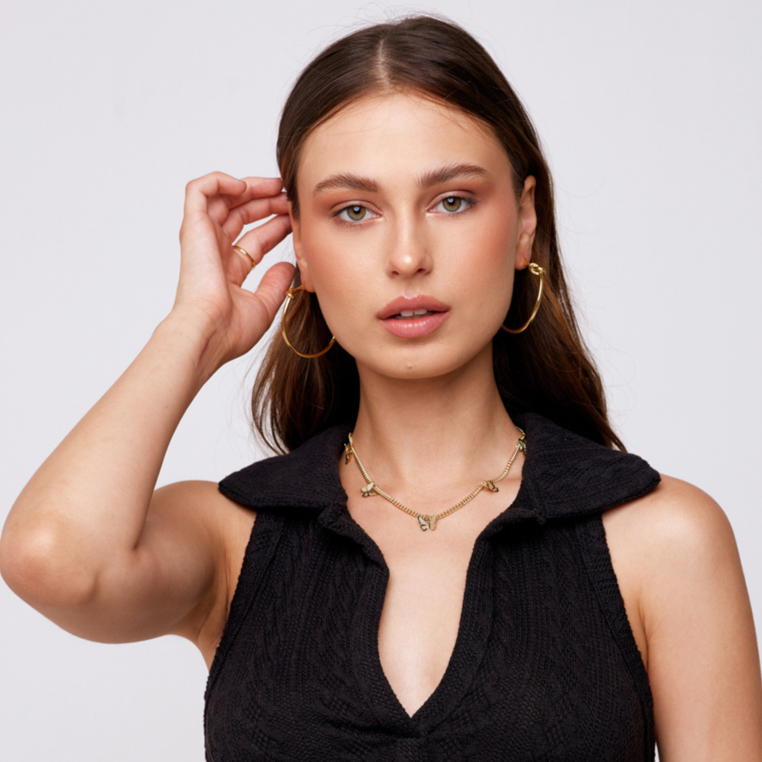 The Mimi Necklace features a 15.75-inch length with a 3-inch extender for adjustable wear. Crafted from 18K gold-plated copper with a sterling silver post, it’s safe for sensitive ears and designed to resist tarnishing. Waterproof and durable, this piece combines elegance with everyday practicality. To keep its shine, avoid contact with soaps, perfumes, and lotions, and polish gently with a lint-free microfiber cloth. Perfect for adding a refined touch to any outfit while ensuring lasting quality.