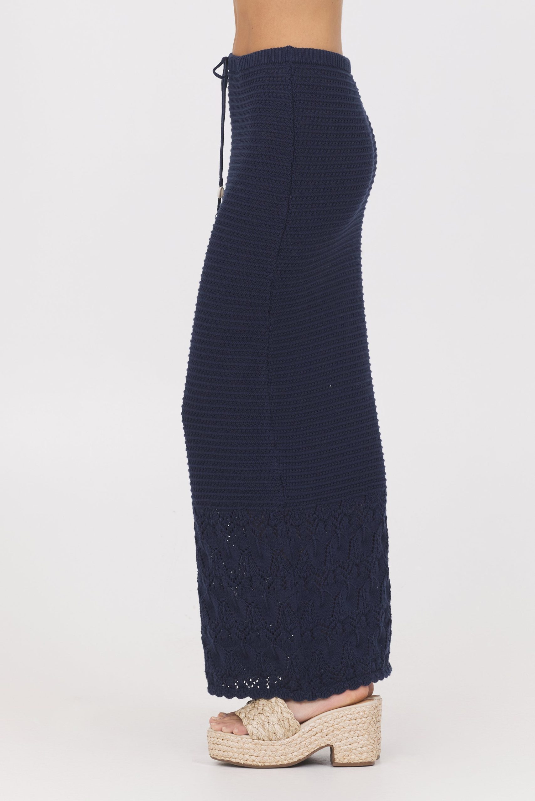 The Navy Crochet Maxi Skirt combines comfort and style with its elastic waistband and adjustable tie detail, ensuring a perfect fit. Crafted from delicate crochet fabric, this skirt offers a lightweight, breathable feel ideal for warm weather or layering. Its elegant design makes it a versatile addition to your wardrobe, suitable for both casual outings and more polished looks.