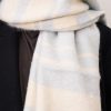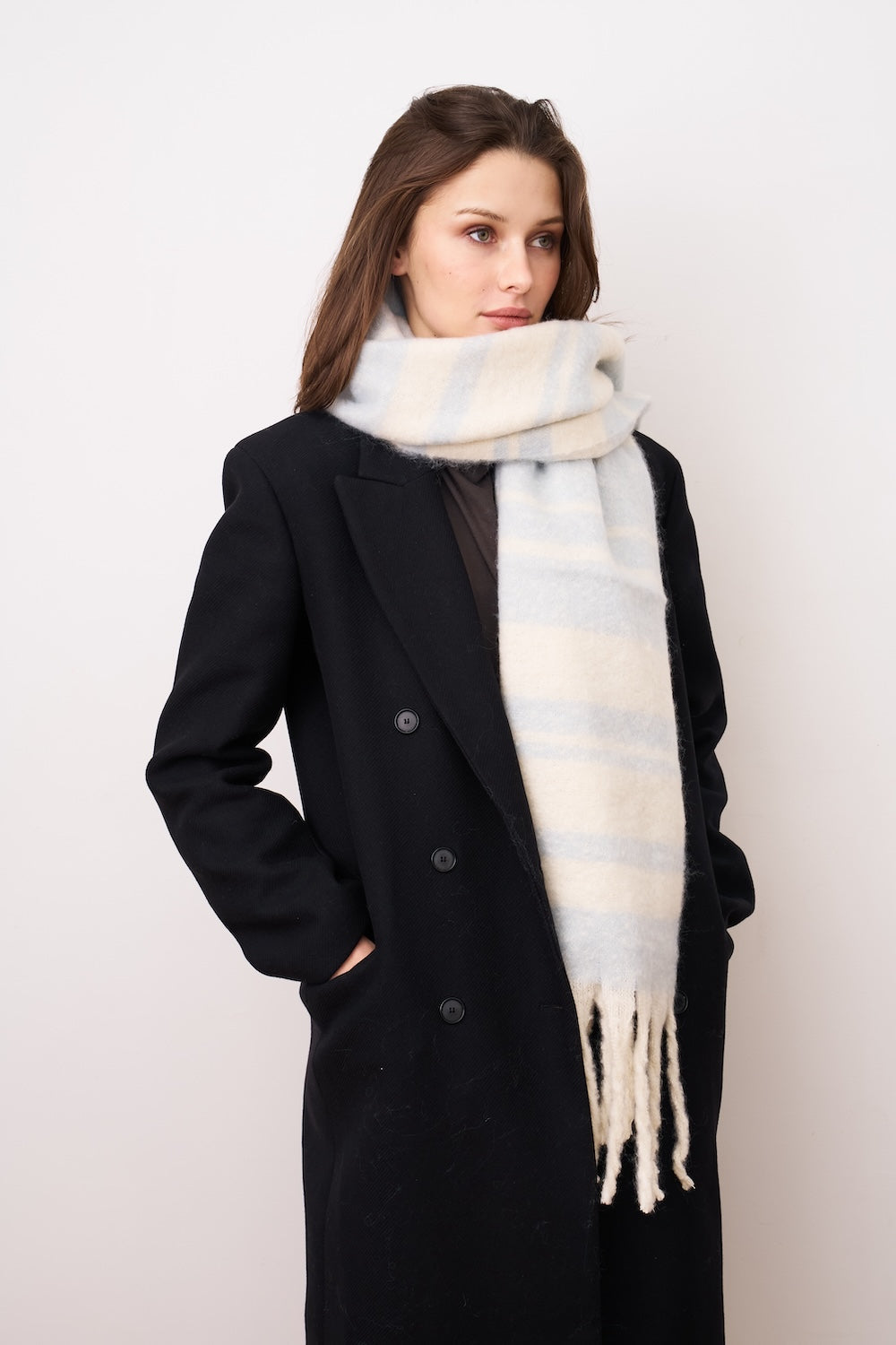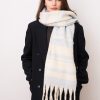 This variegated stripe scarf features a soft brushed texture and delicate fringe tassels, crafted from 100% polyester for lightweight warmth and durability. Its versatile blue tones add a subtle pop of color to any outfit, making it an ideal accessory for both casual and polished looks.