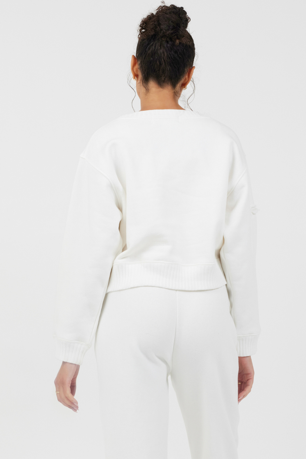The White Essential Fleece Crewneck combines comfort and style with its soft fleece fabric and relaxed cropped fit. Featuring a classic crewneck and subtle distressed pocket details, this versatile piece adds a modern edge to your casual wardrobe while ensuring cozy wear throughout the day.